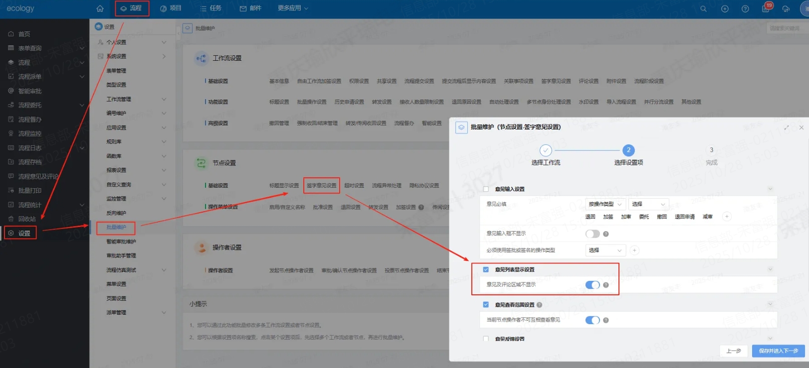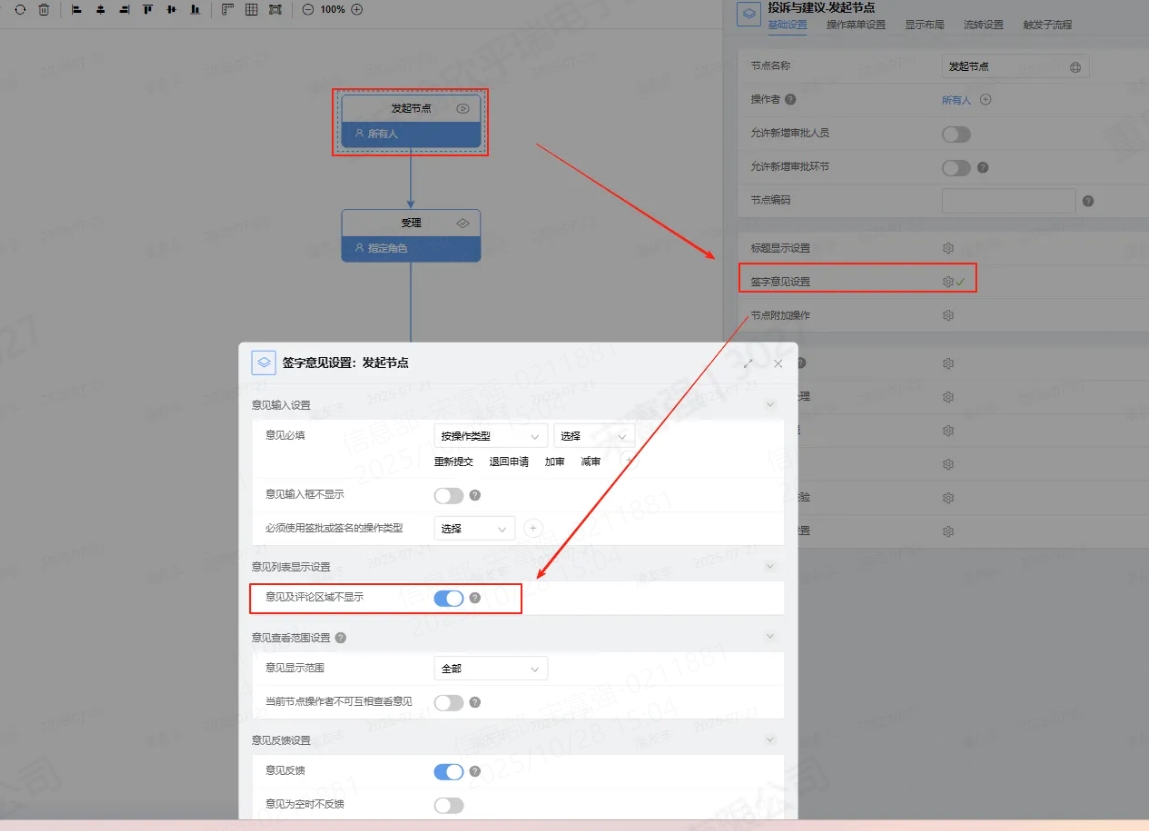 当前位置: 首页 技术知识>泛微OA流程表单特殊页面设置 泛微OA流程表单特殊页面设置 时间:2025-05-28 14:54 浏览:11 类型:技术知识 场景一: 若不需要显示流程图等信息,请参照如下方式设置 效果如下: 场景二: 若不需要显示签字意见,请参照如下设置 或者在此处单个节点设置 效果如下: 场景三: 若不需要显示系统信息,参照如下操作 效果如下: 网站建设的目的是什么? 百盛建站2021年五一放假通知 相关新闻 百盛建站2025年端午节放假通知 ... 2025-05-23 11:09 百盛建站2025年五一劳动节放假通知 值五一劳动节来临之际,根据国家相关规定并结合公司实际情况,经研究决定... 2025-04-25 07:26 百盛建站2025年清明节放假通知 ... 2025-03-30 14:27 百盛建站2025年春节放假安排 值此新春佳节来临之际,根据国家相关规定结合我司实际情况,经公司研究决定... 2025-01-14 07:52 相关推荐 2021-05-24 15:54 网站建设服务 查看详情 2021-04-30 09:25 汇齐餐饮文化有限公司网站建设方案 查看详情 2021-05-24 16:36 推广优化服务 查看详情 2019-05-24 14:15 协和医院网站建设案例 查看详情 2019-07-24 14:15 无忧自驾网站建设方案 查看详情 公司新闻 MORE+ 百盛建站2025年端午节放假通知 百盛建站2025年五一劳动节放假通知 百盛建站2025年清明节放假通知 百盛建站2025年春节放假安排 百盛建站2025年元旦节放假通知 微信小程序商城制作需要考虑哪些问题 建站百科 MORE+ 外贸在线购物商城用什么系统建设好 如何替换掉手机站中的www 在phpcms列表或主页中显示浏览量 php不错的开源商城系统 网站建设之前应考虑哪些因素 模板建站有哪些优点和缺点 营销推广 MORE+ 为何小程序如此受欢迎 怎么玩转私域流量和裂变营销 私域流量转化新办法,公众号文章中可插入产品卖货 公众号主要用来发布哪些类别的内容? 如何利用旅游小程序解决行业痛点? 如何让企业小程序获得高流量